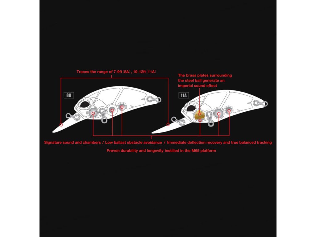 Při návrhu Cranku M65 11A byla pozornost byla věnována maximální odolnosti. Wobler má zesílené stěny i vnitřní přepážky. Lopatka byla kompletně přepracována, aby vydržela časté nárazy do kamenů i zatížení při zdolávání velkých dravců. Tvar lopatky byl upraven, aby wobler snadněji obeplul překážky bez ztráty chodu i pracovní hloubky a také méně váznul v kamenech. Samozřejmostí je osazení wobleru většími kroužky a pevnějšími trojháčky.