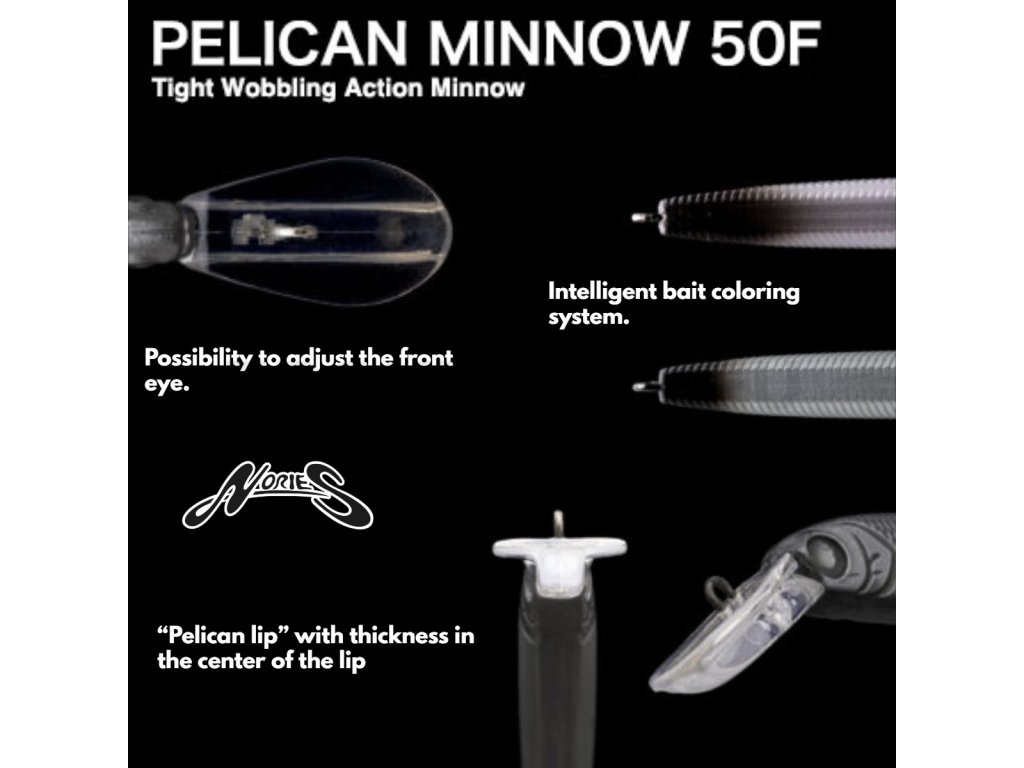 Nories Pelican Minnow 50F je nový typ wobleru pro trout area přívlač. Ideální způsob vedení je stop-and-go, kdy wobler při zastavení začne stoupat. V tento moment pstruzi útočí na koncovou část wobleru, která díky černému zakončení slouží jako tzv. "target point" (bod na těle kam dravci útočí). Při vedení pelikána doporučujeme střídat rychlosti vedení, pro zjištění aktivity pstruhů. Wobler Pelican představuje trumfové eso pro velké závody a dny, kdy pstruzi neberou.
