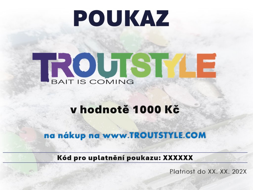 Poukaz k nákupu na eshopu Troutstyle v hodnotě 1000 Kč, jsem skvělý dárek pro každou příležitost.